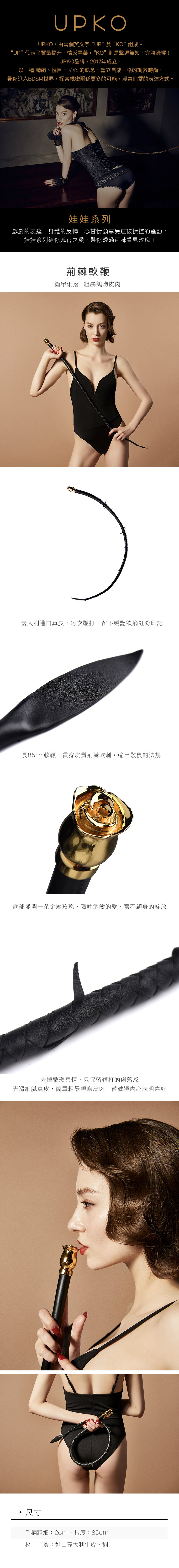 85公分長的皮革軟鞭是最可怕的規則執行者,手柄末端的金屬玫瑰花蕾是危險的愛情和無畏鬥爭的類比。