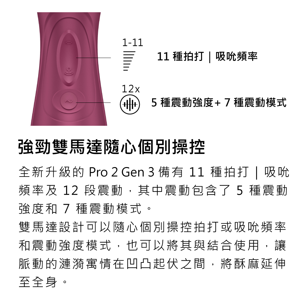 ◆強勁雙馬達11 種拍打吸吮頻率及12段震動