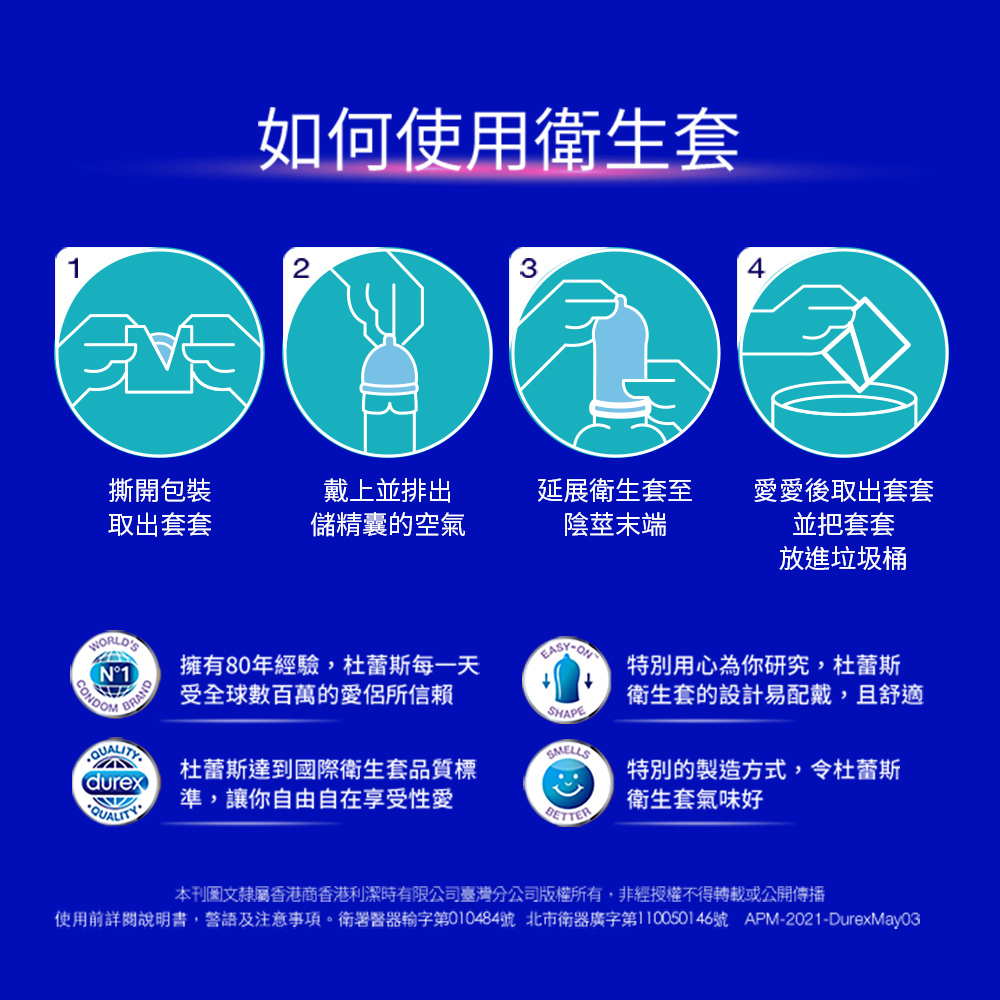 6-保險套必須保存在陰涼、乾燥和不接觸酸、鹼、油的環境中。如暴露上述條件後,保險套會變得發黏、硬脆,即使在保存期限內也不可再使用。